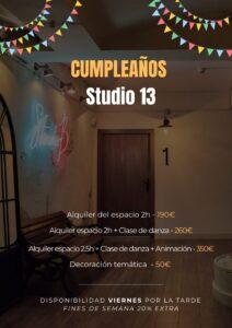 Studio 13 Danza es una escuela de baile en el barrio de Sant-Gervasi, Barcelona. Imparte distintas disciplinas como danza jazz, street dance, hip hop, danza fusion jazz, ballet jazz, sevillanas y danzas urbanas. Hay clases para todas las edades, desde iniciación a la danza para niños y niñas a partir de 2 años hasta clases de ballet clásico avanzado para adultos.